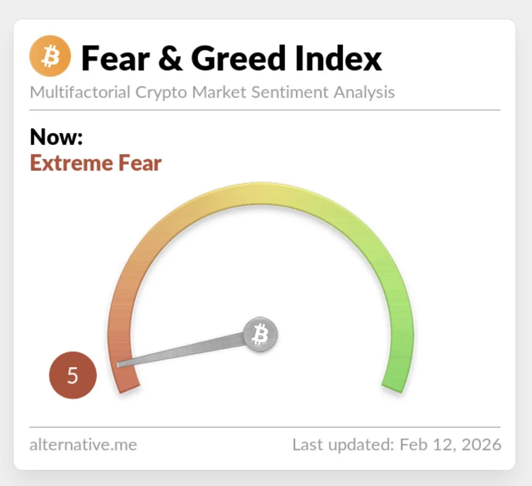 The Crypto Fear and Greed Index has dropped to a level of 5, marking one of the lowest readings in its history. This level is widely considered extreme fear and signals a market environment driven by strong negative sentiment.