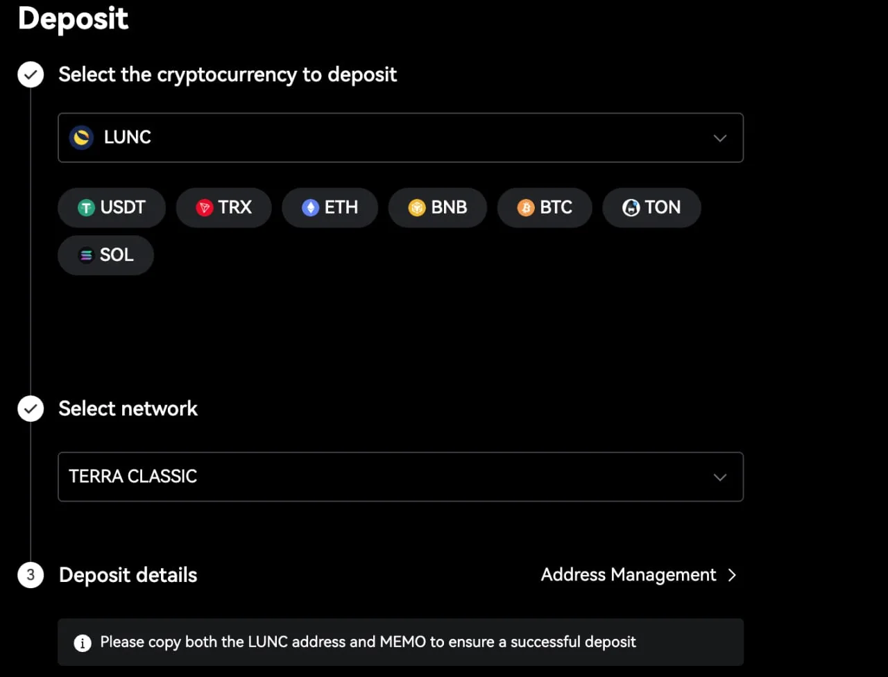 When depositing LUNC on LBank, users must ensure they select the correct network, which is the Terra Classic network. The platform also requires both the wallet address and the memo to be included when sending funds. This is necessary to ensure deposits are processed correctly and credited to the appropriate account.