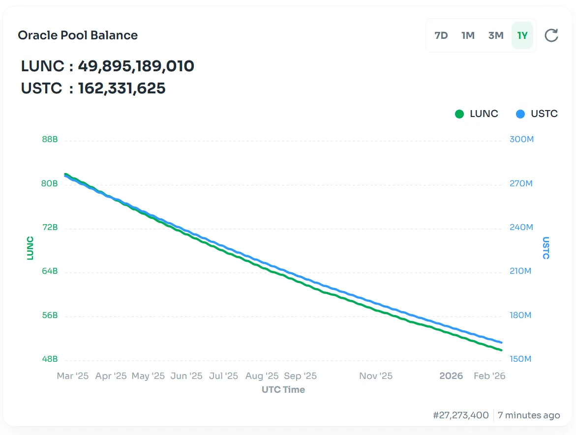 The Oracle Pool is a reserve of LUNC and USTC used to pay staking rewards to validators and delegators. These rewards help keep the network active, secure, and decentralized. When the pool balance decreases over time, it signals that more rewards are being paid out than the pool is receiving in income.