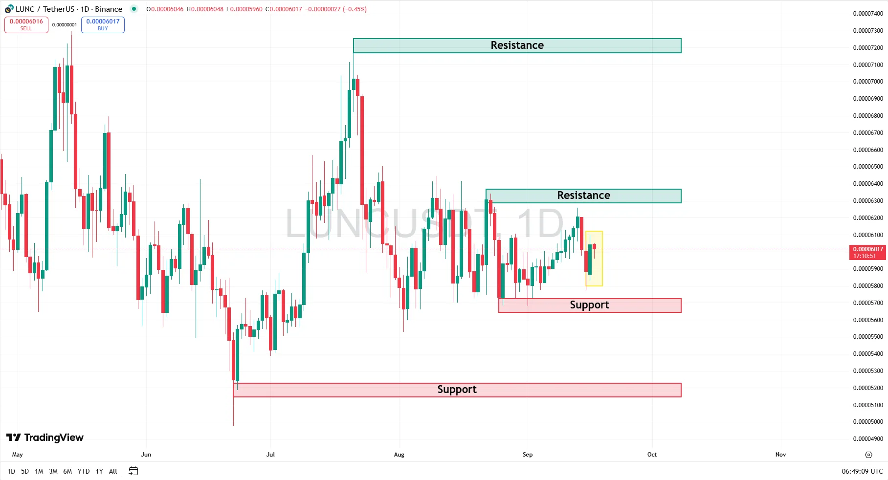 Currently, LUNC is trading near 0.000061. Key levels to watch include: