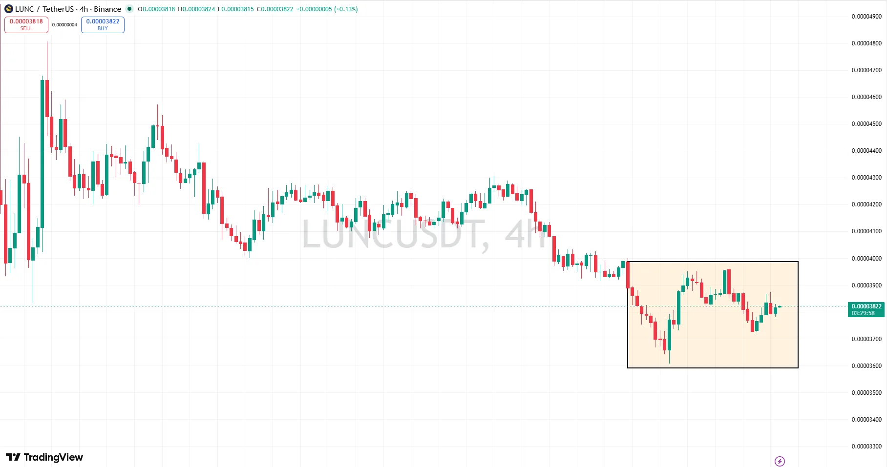 Based on the 4 hour LUNCUSDT chart, the market structure shows a clear short term downtrend followed by consolidation.