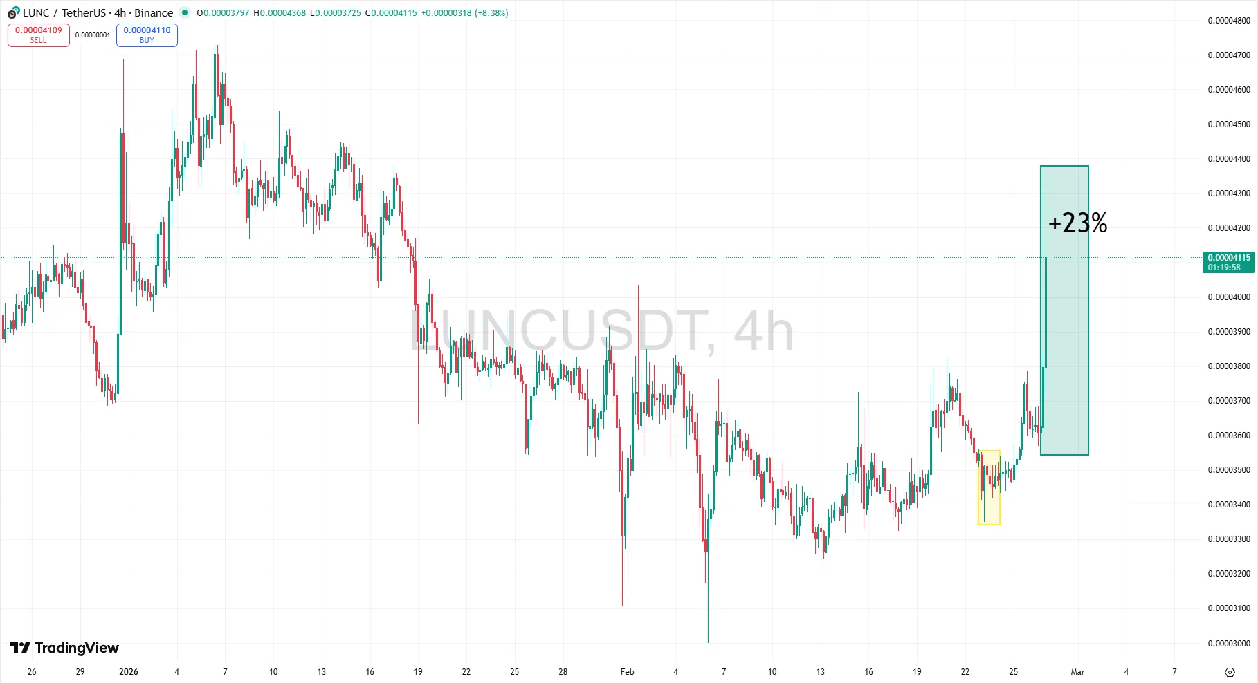 Terra Classic LUNC recorded a sharp 23 percent price increase within just eight hours, drawing significant attention from traders and the broader crypto community. The sudden move comes amid renewed developments surrounding legal action connected to the 2022 Terra ecosystem collapse.