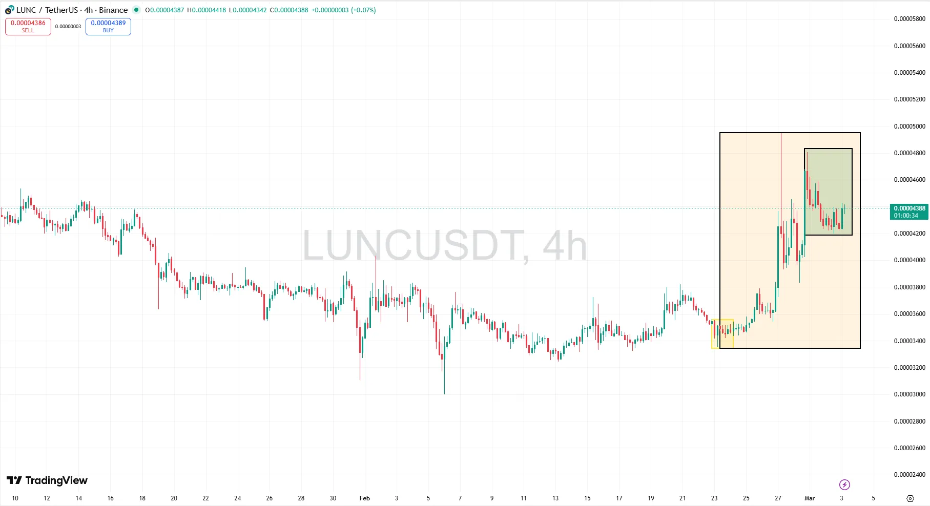 A confirmed breakout above 0.000048 with increased volume would strengthen the probability of reaching the short term target zone.