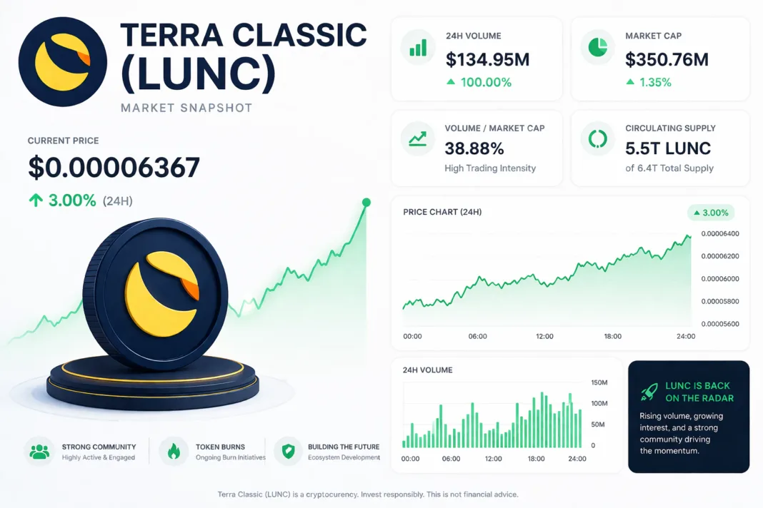 The latest market snapshot for Terra Classic (LUNC) signals renewed optimism, with price action climbing to $0.00006367 and posting a solid 3% gain over the past 24 hours. While modest on the surface, this uptick reflects a deeper shift in sentiment as traders and long-term holders re-engage with the asset.